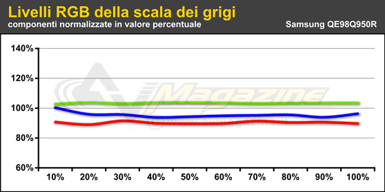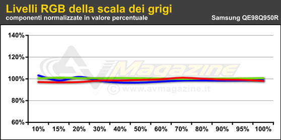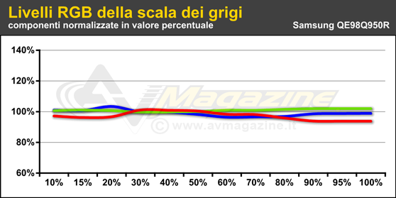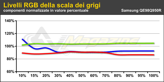 Con la calibrazione a due punti, il bilanciamento del bianco acquista naturalezza e coerenza invidiabili ma anche qui, per la perfezione assoluta serve una calibrazione su 20 punti, soprattutto per contenere una certa "esuberanza" nel riprodurre le medie luci (tra il 20% e il 50% di intensità del segnale in ingresso) e - al contrario - qualche incertezza per le basse luci che sono un pochino indietro.