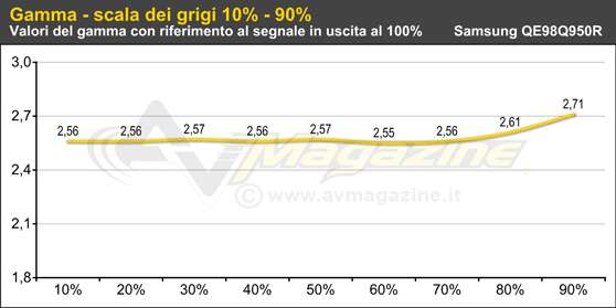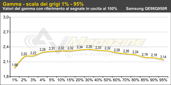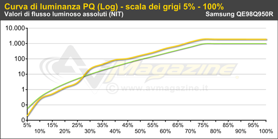 Con segnali HDR10 il Q950R dà prova di una notevole potenza, con livelli di luminanza che, se non vengono ben domati, rischiano di consigliare l'utilizzo un paio di occhiali da sole. In default il TV si comporta più o meno come nella modalità "Naturale" dell'alta definzione, esagerando ancora di più. Anche in questo caso, le misure qui in alto si riferiscono alle impostazioni "Film", anche se in default, in cui ritroviamo quasi le stesse prestazioni incoraggianti, con bilanciamento del bianco piuttosto vicino al riferimento e curva di luminanza con clipping.