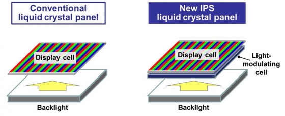 Abbiamo parlato di questa tecnologia nel corso del 2016 in questo articolo. Un display del genere ha una dinamica superiore a quella di un display OLED, un numero di sfumature superiore (11 bit per componente, 10 per ogni pannello), zero ABL, zero "effetto memoria" e problemi trascurabili di "burn-in". L'unico aspetto negativo riguarda l'efficienza luminosa dell'intero sistema che diventa purtroppo molto bassa, con la necessità di utilizzare potentissime unità di retro-illuminazione, dotate di sofisticati e costosi sistemi di raffreddamento.