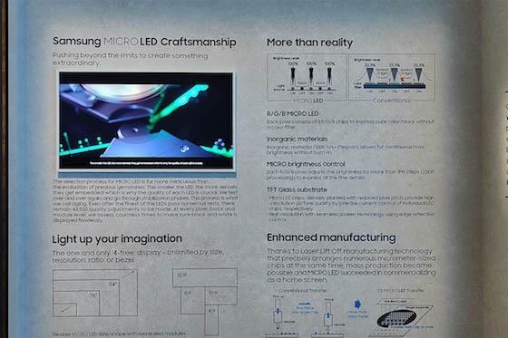Questa estrema miniaturizzazione porta ad ottenere pixel composti quasi interamente (ben oltre il 90%) da una superficie nera. Per dare l’idea delle grandezze di cui si parla, Samsung ha mostrato a porte chiuse una fialetta con una manciata (pochi millimetri) di quella che sembrava sabbia, ma che in realtà erano gli oltre 24 milioni di MicroLED necessari per realizzare un TV Ultra HD. La seconda innovazione introdotta da Samsung consiste nel modo in cui i moduli si connettono tra loro. Per poter assemblare un televisore partendo da una struttura modulare è necessario che i moduli non abbiano una cornice, altrimenti l’immagine risultante verrebbe interrotta dalla cornice stessa presente tra un modulo e l’altro. Serve però un modo per portare il segnale su tutto lo schermo ed ecco la soluzione: inserire piste che corrono lungo il bordo dei moduli. Questi contatti distribuiscono il segnale tra tutti i moduli contigui e consentono di eliminare la cornice.