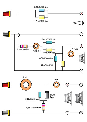 Il filtro crossover della 804 D3 è simile a quello proposto da qualche anno dal costruttore: un condensatore di caratteristiche incredibili sul tweeter e un terzo ordine sui woofer, appena smorzato da una piccola resistenza verso massa. Il passa banda del midrange, dopo due ohm di “pregiatissima” attenuazione, vede i componenti del passa alto e del passa basso incrociati, per meglio gestire lo smorzamento. Tutti i condensatori sono Mundorf di livello estremamente elevato e con tensioni di rottura incredibilmente alte. I piccoli condensatori azzurri sono dei bypass da 10 nanoFarad sulla cui efficacia, di fronte a tanta qualità, non saprei dire. L’incrocio tra i due woofer ed il midrange è stato scelto ad una frequenza relativamente elevata, a circa 400 Hz, una caratteristica che si evidenzia bene anche nella risposta al gradino.