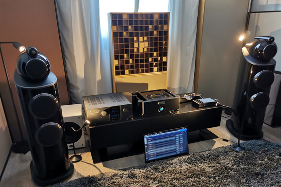 Iniziamo col dire che in esposizione statica c'era il flagship dei giradischi Yamaha, il massiccio modello GT-5000. Ai lati del set troneggiava un paio di speaker dell'ultimissima serie di Bowers & Wilkins, modello 803 D4, prima presentazione nazionale di un modello (declinato nell'ultima versione) che ha sempre riscosso un grande successo, in quanto giudicato in grado di garantire una resa sonora non troppo dissimile da quello superiore: un tre vie da pavimento da più di 62 chilogrammi di peso offerto ad un prezzo più abbordabile.
