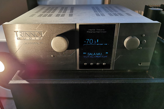 La fonte era invece costituita da una declinazione 'custom' di un NUC Intel senza ventole: un piccolo mini-PC con 'sistema operativo' Roon per catalogare e riprodurre tutta la libreria musicale posseduta con riproduttori compatibili. Uno dei player compatibili è lo 'streamer' integrato nel pre-pro Trinnov Altitude 32, macchina straordinaria, nota per la qualità sonora e per le routine di correzione sonora attiva digitale (DRC, Digital Room Correction). Basti ricordare, a titolo esemplificativo, che le curve di risposta che possono essere impostate possono rispondere ad intenti diversi: l'audiofilo tipico le userà per calibrare e annullare gli effetti deleteri derivanti dall'ambiente, cercando di ricreare una risposta lineare del suono tramite l'annullamento delle interazioni ambientali, mentre le persona con deficienze uditive (dovute a traumi, malattie o più semplicemente all'incedere dell'età) o chi ama l'esaltazione di una o più gamma di frequenze in particolare potrà ottenere una versione customizzata del suono, memorizzando curve di risposta a lui più idonee e/o gradite in base al genere musicale ascoltato.