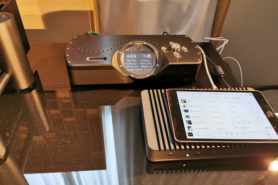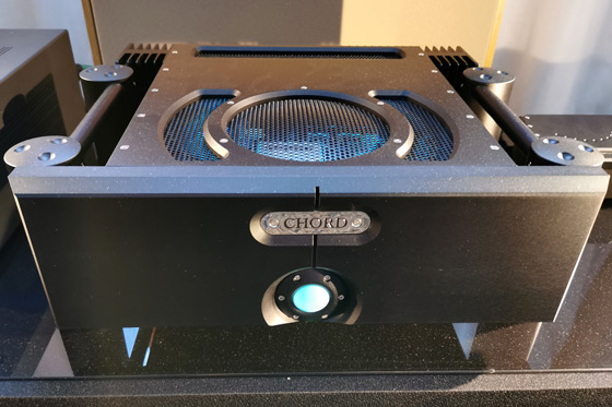 Dal Trinnov Altitude 32 il segnale, rimanendo nel dominio digitale, passava con AES3 (AES/EBU) al bellissimo Chord Dave reference DAC, preamplificatore e amplificatore di cuffia dotato anche di altri ingressi digital: BNC Dual Data, Toslink e USB-B per segnali digitali fino al 768kHz DXD e Quad DSD. Lo splendido oblò superiore del preamplificatore, oltre a favorire la messa a punto iniziale consente anche una chiara visualizzazione del tipo di segnale che sta trattando in quell'esatto momento. Tramite le uscite analogiche (RCA o XLR bilanciate) il segnale finiva nell'altrettanto bellissimo finale Chord Ultima 5. Si tratta di un modello derivato dal leggendario finale stereo SPM 1200 MKII; quest'ultima versione ha un'alimentazione switching "HF switch", l'advanced dual-feed-forward error-correction, 32 dispositivi MOSFET proprietari, eroga 300 W RMS su 8 Ohm e ha mostrato grandi doti di pilotaggio delle grandi Bowers & Wilkins, da sempre speaker piuttosto capricciosi in termini di modulo di impedenza e avidi di molta corrente lineare.