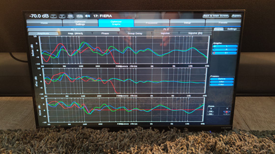 Un piccolo display posto in basso, davanti alle elettroniche, consentiva agli astanti di visualizzare via via le operazioni che venivano poste in essere. Utilizzando le memorie del Trinnov, il set è stato fatto suonare in 3 diverse configurazioni: 1, liscia con il solo effetto prodotto dalla correzione acustica passiva laterale e a soffitto (proprietaria, di tipo assorbente e diffondente, con pannelli piuttosto sottili che ne favoriscono il posizionamento in ambiente, progettata, realizzata e installata da Videosell), 2, con correzione acustica attiva inserita, 3, con correzione acustica attiva inserita e i sub allineati.