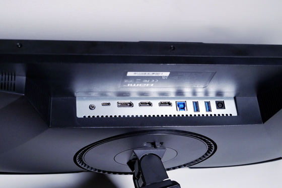 Sul retro del monitor, rivolte verso il basso ci sono tutte le opzioni di connettività che il KTC M27T20 ci offre, tra cui uno switch KVM utile per collegare due differenti computer ad un set monitor, tastiera e mouse, due porte USB3.0, una porta USB 3.0 upstream, 2 ingressi HDMI 2.0 che permettono una risoluzione di 2560x1440 a 144Hz, una DisplayPort 1.4 2560x1440 a 165Hz, un connettore USB Type-C con funzionalità di reverse charging fino a 90 W (5V/3A, 9V/3A, 12V/3A, 15V/3A, 20V/3,25A, 20V/4,5A) che funge anche da ingresso video UHD 4K ed una uscita cuffie con classico minijack da 3,5mm.