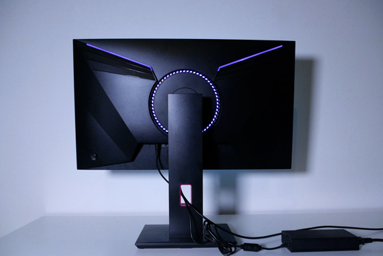 L’inserimento nei connettori dei vari cavi, ad onor del vero, non è particolarmente agevole, visto il posizionamento dei connettori stessi, e può risultare ancora più sgradevole se il monitor è sistemato in una posizione non completamente raggiungibile. Sull’asta posteriore che sorregge lo schermo è ricavato un ampio foro da cui far passare tutti i cavi collegati in maniera da mantenere un maggior ordine sulla nostra scrivania. In dotazione anche due altoparlanti integrati e sul dorso una serie di LED RGB che offrono un effetto ambient light.