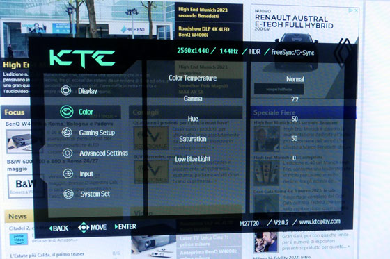 Tramite il menù Color è possibile scegliere la temperatura colore tra 4 modailtà (User, cool, Warm e Normal), il gamma impostato sul valore standard 2.2 di default, la tonalità, la saturazione ed il controllo della luce Blu.
