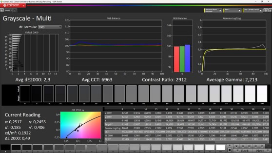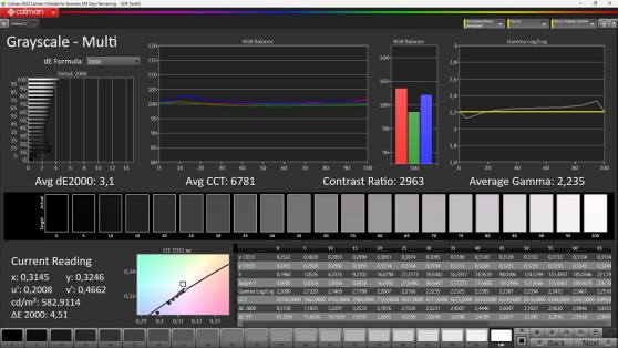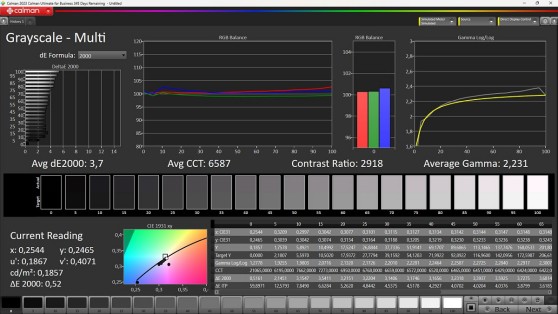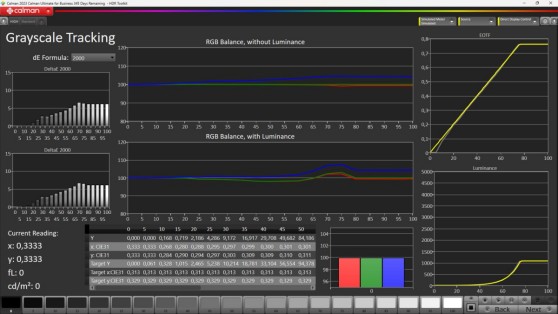 Modalità 'Nativa'. Come già anticipato, la calibrazione si limita quasi esclusivamente al bilanciamento del bianco, per giunta su un solo punto e soltanto nella modalità predefinita 'Native' che però è quella che consigliamo per chi è interessato alla post produzione video. Qui in alto il risultato per la scala dei grigi.
