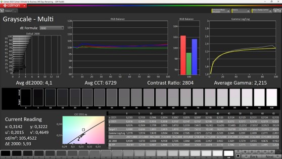Abbassando la potenza della retroilluminazione, in modo da fissare il picco di luminanza a 105 NIT, cambia solo lievemente il bilanciamento del bianco che diventa appena più freddo e fa avanzare di un ulteriore punto il Delta E uv degli step della scala dei grigi a più elevata luminanza. Le prestazioni generali rimangono comunque abbastanza buone oltre che migliorabili con la calibrazione.