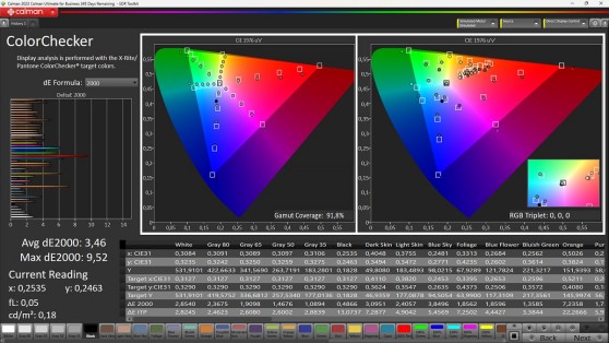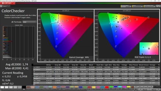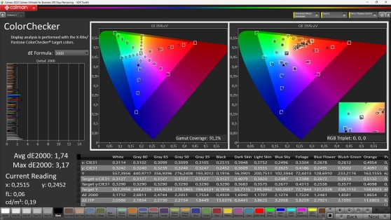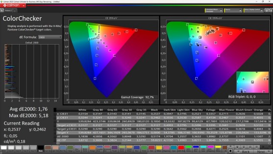 In modalità sRGB arrivano ottime notizie anche dalla riproduzione dei colori. Il gamut viene coperto al 92,5% per colpa di un piccolo errore di rendering sul rosso, migliorabile probabilmente con un aggiornamento firmware. Le saturazioni intermedie sono buone con errori abbastanza contenuti; buone anche le coordinate del test con patch 'Color Checker'con errori sull'incarnato estremamente contenuti.
