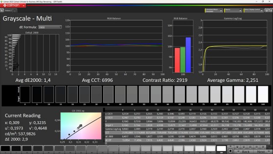 Come abbiamo già visto nell’analisi del menù e nelle misure, non ci sono grandi possibilità per una calibrazione efficiente del nostro display, se non una regolazione dei toni e della saturazione, la scelta del gamma e di alcune modalità predefinite. Le modalità HDR non possono essere forzate manualmente. Il display, pur essendo dotato di pannello con tecnologia LCD-VA (Vertical Alignment), presenta un angolo di visione abbastanza ampio, paragonabile a quello di un display IPS ma con un rapporto di contrasto nativo di gran lunga più elevato ed esaltato dal local dimming con un numero di zone elevato. Scegliendo una modalità predefinita i gradi di libertà per la regolazione del display vengono quasi completamente a mancare e l'unica alternativa percorribile è utilizzare una 3D LUT con una LUT-Box esterna oppure in un software compatibile, come ad esempio DavinciResolve.