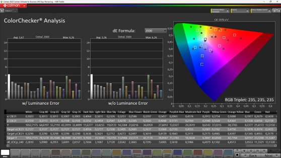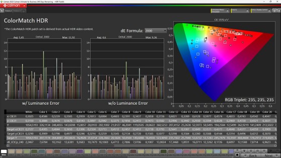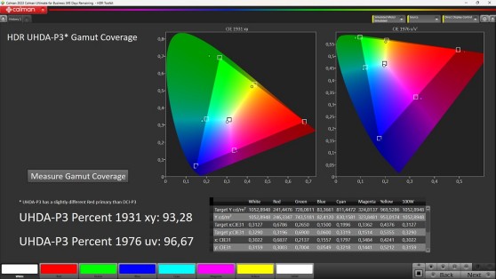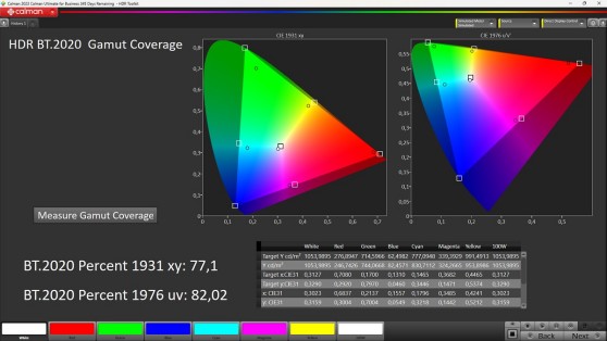 Ottime notizie anche dal gamut che sfiora il 97% di copertura di quello DCI-P3 e supera di misura l'area dell'82% rispetto allo spazio REC BT.2020, quindi sensibilmente di più rispetto a quanto fatto con segnale a gamma dinamica standard. Sarebbe molto bello poter accedere a queste prestazioni anche con segnale in ingresso di tipo standard e delegare la conversione al software di post produzione...