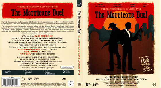 Rimaniamo in Europa con Morricone per un omaggio tributatogli dalla Danish National Symphony Orchestra (d’ora in avanti DNSO), che nella cornice della DR Concert Hall di Copenhagen, diretta da Sarah Hicks, ha registrato The Morricone Duel. Questa orchestra ha pubblicato molti concerti in blu-ray, negli ultimi anni, ricorrendo ad una conduzione sempre diversa. In effetti anche il solo A night piece, tratto da Taxi driver (Bernard Hermann), vale il costo del disco, che peraltro contiene anche altri interessanti brani tra i quali Il Padrino, composto da Nino Rota. L'audio anche in questo caso è proposto nei formati PCM stereo o nel lossless DTS-HD Master Audio 5.1, con video in 1080i. Suono equilibrato, con tutto al posto giusto e tonalità naturali, in piena tradizione DNSO.
