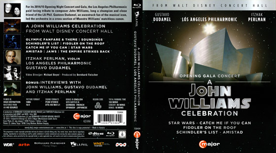 Rimaniamo negli Stati Uniti per planare in un’altra terra ridente e assolata, la California, e più precisamente a Los Angeles, intanto per ammirare l'ennesimo celebre edificio titanioso di Frank Owen Gehry, la Walt Disney Concert Hall. Nel Blu-ray Disc A John Williams Celebration, opening gala concert, la Los Angeles Philarmonic esegue musiche del compositore preferito di Spielberg diretta prima da Gustavo Dudamel e, nel secondo brano proposto, eccezionalmente dal compositore medesimo. Consiglio la intro anche solo per godere delle ammalianti forme della WDCH, che richiamano quelle del famoso predecessore, il Museo Guggenheim di Bilbao.