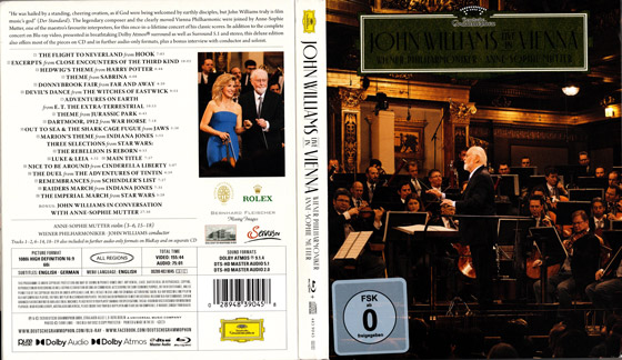 Passiamo alla chicca dell'intera selezione, in cui l'americanissimo John Williams sceglie l'Europa, e più precisamente Vienna, per dirigere nientepopodimeno dei Wiener Philarmonicher, con la virtuosa del piccolo quattro corde ad arco Anne-Sophie Mutter per celebrare un omaggio a se stesso. Di questo John Williams live in Vienna abbiamo già abbondantemente parlato in questo dettagliatissimo articolo, dunque sarò estremamente succinto, anche se vorrei profondermi in lodi sperticate. Il Musikverein di Vienna è un vero e proprio tempio della musica, che nulla concede alla possibile spettacolarizzazione del concerto in virtù della religione di Stato che permea tutto il luogo, imposta anche a chi vi entra: la Musica. Che viene qui eseguita ad altissimi livelli, in un ambiente acusticamente favorevole, con l'apporto delle più affermate musicstar. La registrazione offre una resa audio che assurge ai vertici di sempre, non solo in quanto veicolata nei formati DTS-HD Master Audio stereo 24bit/96kHz e multicanale 5.1 24bit/48kHz, con menzione d'onore per la versione Dolby Atmos 9.1.4 (suppostamente una 24bit/48kHz con flusso TrueHD/MLP), ma in quanto la ripresa microfonica e il lavoro in post-produzione son riusciti a preservare un suono straordinario con una naturalezza e un'ambienza quanto mai credibili.