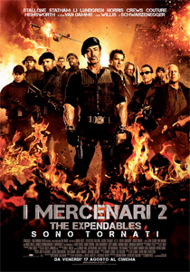 Titolo: I Mercenari 2 Titolo originale: The Expendables 2 Genere: Azione Durata: 102' Regia: Simon West Attori: Sylvester Stallone, Bruce Willis, Arnold Schwarzenegger, Jason Statham, Liam Hemsworth, Jean-Claude Van Damme, Dolph Lundgren, Scott Adkins, Chuck Norris, Terry Crews Distribuzione: Universal Pictures Sito ufficiale: theexpendables2film.com |