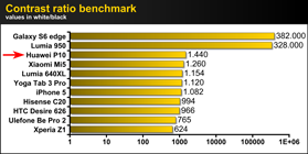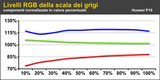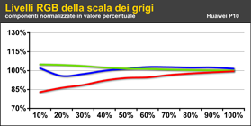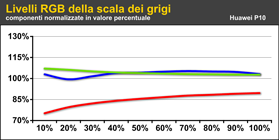 La qualità del display del P10 è molto elevata ed è la migliore in assoluto tra tutti gli smartphone con tecnologia LCD testati fin'ora. La luminanza è seconda solo all'iPhone 5 (con schermo molto più piccolo) e può essere modulata in maniera eccellente, per scendere al di sotto dei 3 NIT. Il rapporto di contrasto nativo, pari a 1.440:1, è il più elevato mai misurato per display di questo tipo (LCD IPS). Selezionando la temperatura colore predefinita "caldo" il valore di massima luminanza scende quasi impercettibilmente, assestandosi a 570 NIT. Con la calibrazione fine invece scende a 530 NIT: il rapporto di contrasto in questo caso scende a 1.345:1 e rimane dunque molto elevato in assoluto. Ottime notizie dai valori del gamma sulla scala dei grigi (media di 2,1) anche se i particolari sulle basse luci (fino al 4%) sono nascosti al di sotto del livello del nero. Maggiori informazioni sulle nostre misure sono disponibili nella guida sui Display benchmark pubblicata al seguente indirizzo.