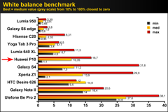 Il bilanciamento del bianco predefinito purtroppo è nella media degli smartphone misurati, con una deriva importante sulle tonalità più "fredde" anche se il "Delta E uv medio rimane comunque attorno a 10, con minimo di 1 (basse luci) e massimo ben inferiore a 20 (alte luci).