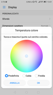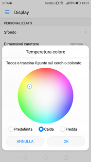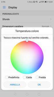 Fortunatamente il menu avanzato della sezione "display" permette di selezionare anche altre temperature colore. Oltre quella "predefinita" c'è anche quella "calda" che ha dato buoni risultati; quella "fredda" non è da prendere in considerazione. In più è possibile calibrare il bilanciamento del bianco, spostando manualmente il cursore sul piano dello spazio colore CIE Lab raffigurato nelle impostazioni. Lo screenshot più a destra si riferisce alle migliori impostazioni che riguardano il nostro esemplare. Aggiungiamo che le operazioni di calibrazione sono un po' scomode poiché non c'è nessuna immagine test a disposizione nella schermata di calibrazione mentre si muove il cursore, costringendo quindi a numerosi tentativi con segnali test adeguati prima di trovare il miglior compromesso.