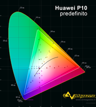 Il gamut del P10 è molto grande e quindi i colori alla massima saturazione sono molto profondi e in linea con i migliori display con tecnologia AMOLED. La riproduzione dei colori a più bassa saturazione è meno precisa, specialmente nelle condizioni predefinite, con rossi e gialli generalmente poco saturi e tutti gli altri colori più saturi, oltre ai comprensibili errori di tinta per colpa del bilanciamento del bianco non preciso. Nella modalità predefinita "calda" le cose vanno meglio ma il massimo si ottiene con la calibrazione fine (grafico più a destra): in questo caso, oltre che correggere gli errori di tinta, la situazione migliora anche per la saturazione di quasi tutti i colori, con l'eccezione delle tinte vicino a verde e ciano. Le prestazioni generali, anche senza calibrazione, sono comunque molto buone e tra le migliori mai misurate.