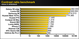 Nell'analisi dei display di smartphone e tablet abbiamo deciso di utilizzare - come sempre - segnali test con APL al 50% (Average Picture Level - livello medio dell'immagine) e con area dello schermo utile per le rilevazioni pari al 25%. In queste condizioni e in modalità predefinita "Schermo adattativo", il Mate 10 Pro sfiora gli 800 NIT, purché il sensore di illuminanza venga sollecitato e simulando di fatto un funzionamento in pieno sole. In stanza completamente buia, si scende al di sotto dei 500 NIT anche con la potenza al massimo. Il rapporto di contrasto è in linea con i migliori prodotti dotati di tecnologia OLED ed è stato misurato in "dark room".