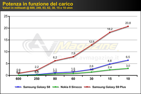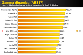 La potenza dell'uscita audio è tra le più basse misurate in assoluto, con poco meno di un milliwatt e mezzo su carico di 30 ohm e una potenza assolutamente insufficiente per cuffie a media e alta impedenza. Per le misure, abbiamo scelto di lasciare il volume al massimo, quindi con potenza di 1,45 mW, poiché con uno step inferiore del volume, si scende ad appena 0,74 mW con ripercussioni immaginabili sui valori di rapporto S/N e gamma dinamica. In questo caso, nonostante il "vantaggio" dei 0,45W in più rispetto a molti terminali, il valore di gamma dinamica è comunque contenuto.