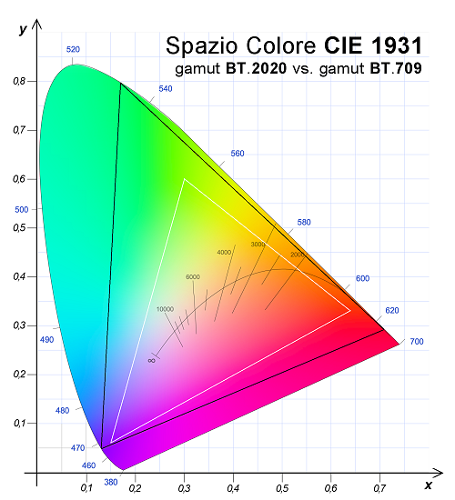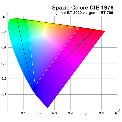 Triangoli di gamut BT.2020 e BT.709 a confronto