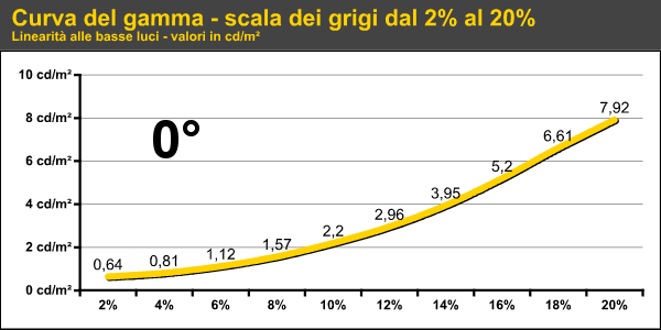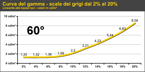 La linearità acquisita ad un angolo di 60° si modifica ulteriormente e la luminanza dei primi gradini della scala dei grigi sale ulteriormente come il gamma, avvicinando ancora di più i livelli dei primissimi gradini.