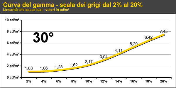Nel grafico qui in basso abbiamo misurato di nuovo la linearità della scala dei grigi alle base luci ad un angolo orizzontale superiore. Già a 30° il gamma tende ad aumentare e i primi gradini della scala dei grigi tendono ad assumere lo stesso valore. Questo si traduce in una scarsa evidenza dei particolari in quelle zone dell'immagine a più bassa luminosità.