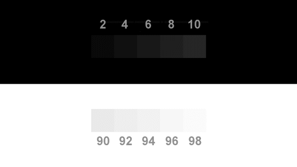 Per verificare soggettivamente la variazione della curva del gamma ai più bassi gradini della scala dei grigi, potete provare ad utilizzare la carta test qui in basso, dopo aver oscurato opportunamente l'ambiente circostante. Dopo aver calibrato in maniera opportuna i valori di luminosità e contrasto in modo da visualizzare il maggior numero di riquadri, provate a variare l'angolo tra i vostri occhi e il display e verificate i vari cambiamenti.