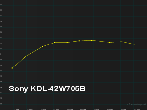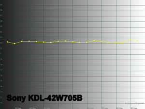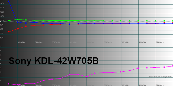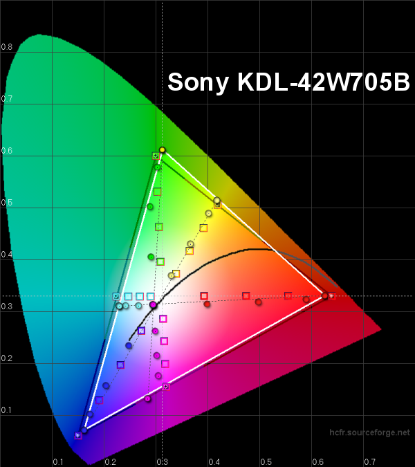 Il gamut colore è quasi coincidente con il quello HDTV anche se il blu è ben all'interno del triangolo di gamut di riferimento e il verde più saturo ma leggermente traslato verso il giallo, come succede al solito per i TV con la classica retroilluminazione con moduli W-LED. Inoltre, sempre a causa delle impostazioni predefinite, c'è la leggera tendenza alla sovra-saturazione delle tinte intermedie.