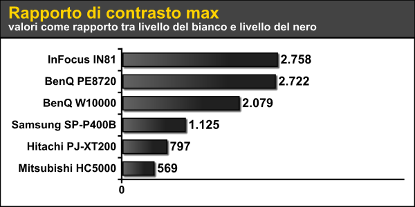 Anche il rapporto di contrasto è molto elevato, è addirittura superiore a quanto dichiarato dal costruttore (è più semplice dichiarare 1.000:1 invece che 1.100:1) e consente di superare in tutta tranquillità quello esibito dai proiettori LCD di qualche generazione fa. Il rapporto di contrasto elevato consente ottime prestazioni anche per visualizzare immagini e video al buio più totale.