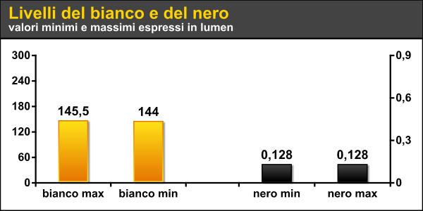 Le curve del gamma a disposizione sono molte e ci siamo fermati a quella più estrema definita "grafica", quando ci sia la necessità di visualizzare contenuti in ambienti illuminati. In questo caso il gamma scende in maniera drammatica, specialmente alle alte luci. In cambio c'è un netto aumento del flusso luminoso per i gradini della scala dei grigi più alti (20 lumen in più in media per i gradini compresi tra il 70% e il 90%), in modo da guadagnare luminosità e quindi intelligibilità in condizioni d'illuminazione difficili.