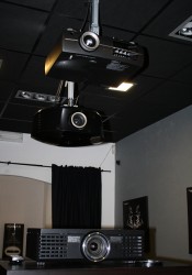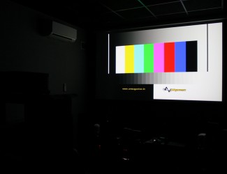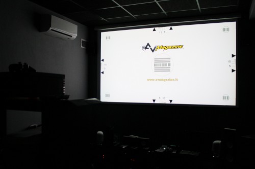 Lo schermo installato da Media Click ha un guadagno pressoché unitario e una base di circa 2,5 metri. I due proiettori Panasonic ed Epson sono piuttosto vicini allo schermo, in modo da sfruttare l'alta versatilità degli obiettivi e senza rinunciare troppo al flusso luminoso. Il Planar è installato a soffitto, in posizione piuttosto arretrata. In quest'ultimo caso il rapporto di tiro è molto più elevato e nonostante la posizione, il Planar non riesce a riempire completamente la stessa superficie. L'immagine quindi è un po' più piccola.