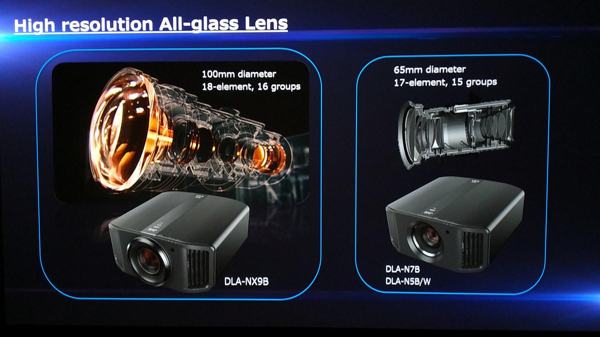Il modello Top di gamma è il DLA-NX9 con microdisplay LCD riflettenti (D-ILA, una declinazione della tecnologia LCoS) a risoluzione nativa 4K (4.096x2.160, con diagonale di 0,69") e con meccanismo e-shift 8K di nuova generazione che raddoppia la risoluzione in diagonale e simula di fatto una risoluzione orizzontale 8K. L'ottica con 18 elementi in 16 gruppi è completamente in vetro, ha un diametro di ben 100mm, è capace di un lens shift che arriva al 100% di escursione in verticale e al 43% in orizzontale (rispetto all'ampiezza in 16:9). L'ottica è accreditata di una luminosità superiore alla media e di una capacità di dettaglio e risoluzione sensibilmente superiori rispetto alle ottiche da 17 elementi in 15 gruppi e diametro da 65mm (anche questi tutti in vetro) che invece sono in dotazione per i modelli DLA-N5 e DLA-N7, che hanno comunque gli stessi microdisplay D-ILA da 0,69" a risoluzione nativa 4K ma senza meccanismo e-shift.