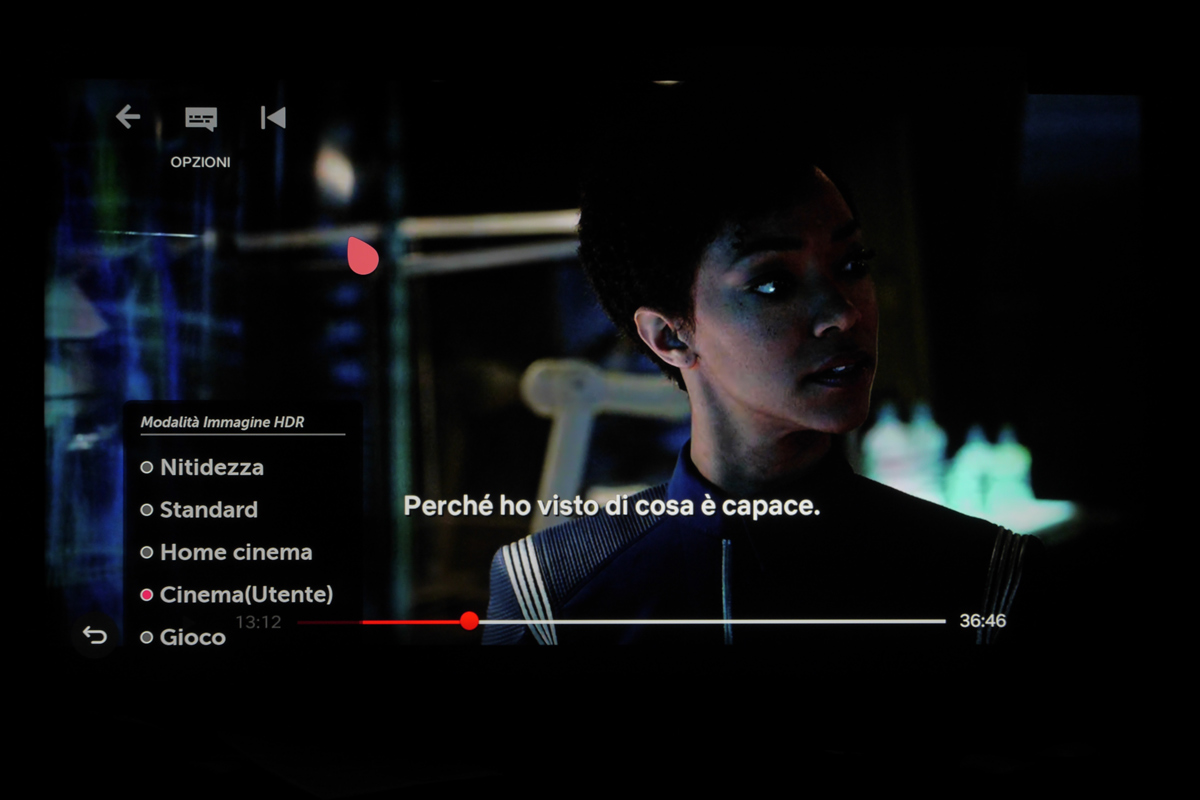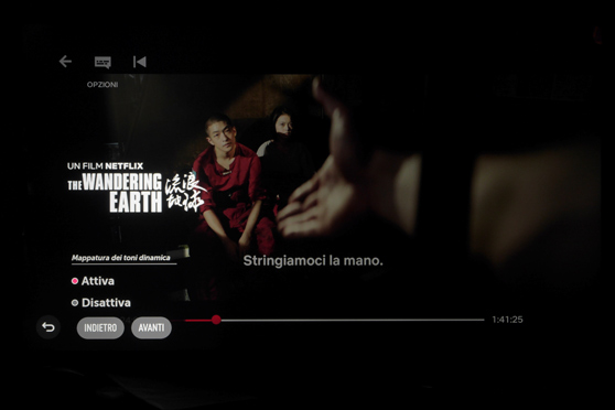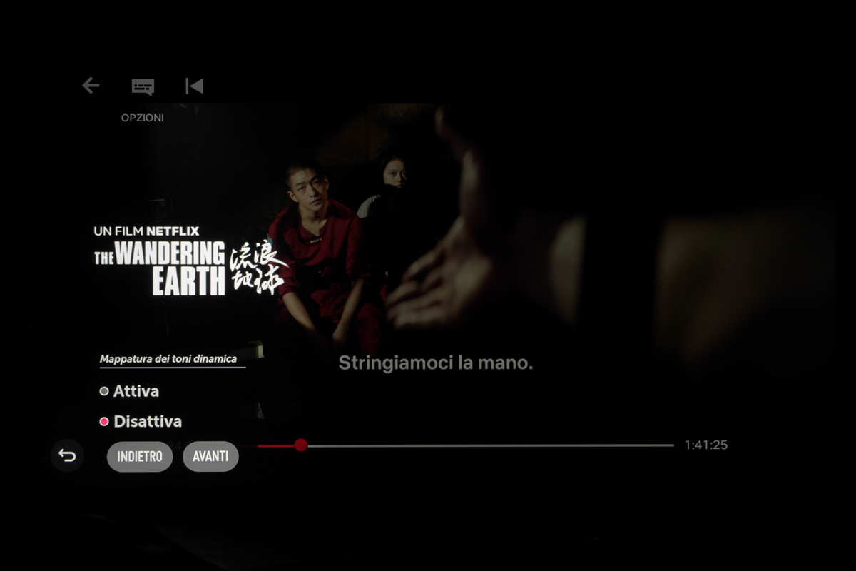 Con la visione di contenuti in HDR10 di riferimento in modalità "Cinema" (Sicario, Soldado, Animali Fantastici 2, Aquaman), ho apprezzato una buona qualità generale, con una precisa riproduzione del colore e con una ricchezza di sfumature che non riesce ad esprimersi al massimo sulle basse luci, a causa soprattutto di un rapporto di contrasto nativo che è pur sempre ingabbiato all'interno dei limiti della tecnologia IPS. D'altra parte, sono rimasto piacevolmente sorpreso dall'efficienza della modalità "Mappatura dei toni dinamica" che misura con precisione la composizione delle immagini e riesce a modulare una curva del gamma che non snatura la dinamica dei contenuti dati in pasto al TV ma che riesce in effetti a dare un bel po' più di respiro alle informazioni sulle basse luci. Nelle immagini qui in alto, una scena da "The Wandering Earth" (Netflix, HDR) al minuto 24...