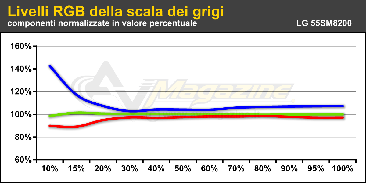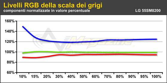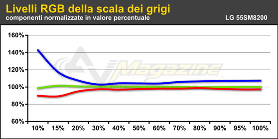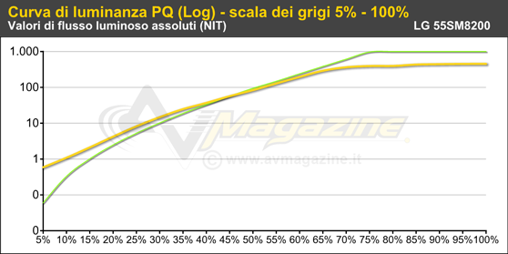 Le due impostazioni con prestazioni migliori sono quelle "Home Cinema" e "Cinema", quest'ultima con risultati molto vicini a quelli con segnali REC BT.709. Giova ricordare che con gamma PQ, la luminanza al 10% di intensità del segnale in ingresso vale quanto un 20% con gamma 2.2: ecco spiegate le deviazioni verso il "blu" al di sotto del 20%, più vicine al livello minimo di cui è capace un LCD IPS.