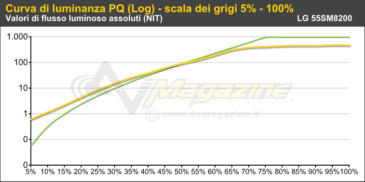 I due grafici della curva di luminanza con ordinate logaritmiche e riferimento con clipping a 1.000 NIT in verde, ci consegnano un display sostanzialmente corretto, con il "bianco diffuso" (segnale in ingresso al 50%) che sfiora i 90 NIT. Il picco di luminanza vale poco meno di 500 NIT, con "roll-off" tra il 75% e 80% del segnale in ingresso. Variando i metadati con MaxCLL a 4.000 NIT, il TV varia correttamente il clipping, con roll-off oltre il 90%. Attivando invece gli algoritmi di intelligenza artificiale, viene attivato una sorta di "gamma dinamico" che dà più spazio alle modulazione dei primissimi gradini della scala dei grigi, riguadagnando quindi la dinamica che è inevitabilmente più indietro per tutti i limiti della tecnologia LCD IPS.