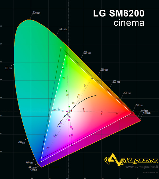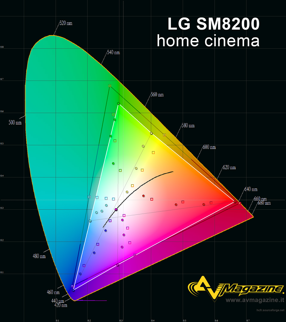I due gamut, catturati per le relative impostazioni predefinite fin qui analizzate, hanno dimensioni più contenute rispetto ai limiti dello spazio colore DCI-P3 ma generalmente più estese (specialmente su blu e verde) rispetto ai TV con tecnologia OLED. La modalità home cinema non convince ed è una diretta conseguenza del bilanciamento del bianco che vira verso il blu. Nella modalità "cinema" invece, la precisione di tinta, saturazione e livello dei colori primari e secondari è encomiabile ed è uno degli aspetti più interessanti di questo TV.
