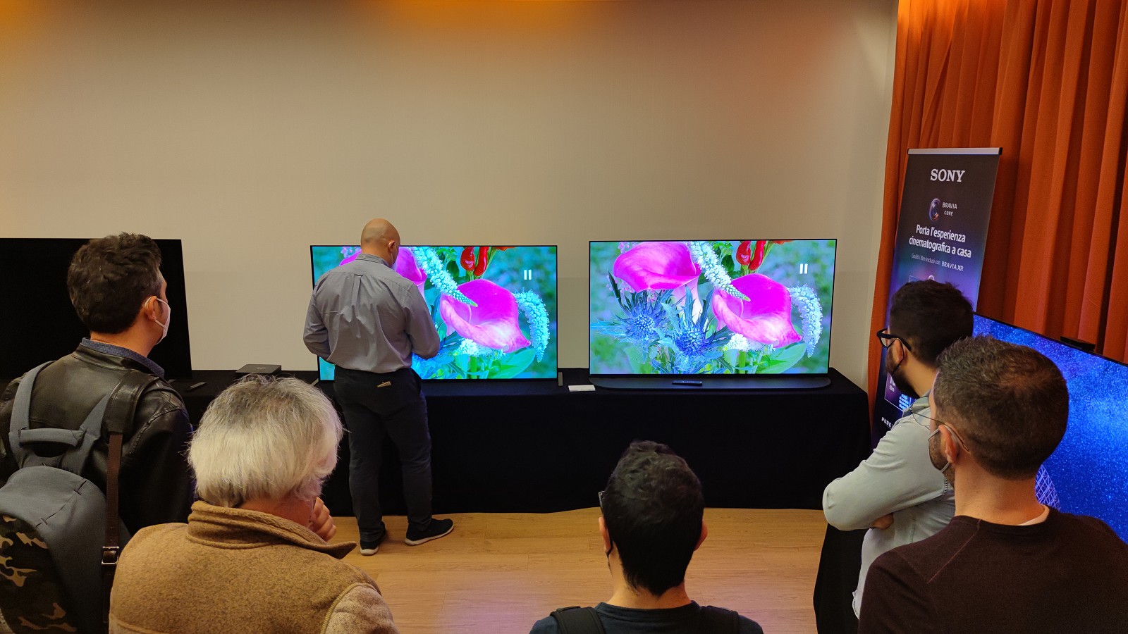 L'evento di presentazione per la stampa sarebbe iniziato alle 17:30. Come da accordi con Sony, io e Roberto abbiamo avuto a disposizione soltanto 60 minuti prima dell'evento, con la speranza - rivelatasi poi vana - di continuare ad effettuare ulteriori test dopo la presentazione: purtroppo alcuni TV, compresi i due esemplari di QD-OLED, sarebbero ripartiti in serata. Per questo motivo, abbiamo stilato una scaletta di misure per importanza, mettendo al primo posto la rilevazione dello spettro di emissione delle componenti cromatiche, estensione del gamut e livelli di luminanza in varie condizioni di funzionamento.