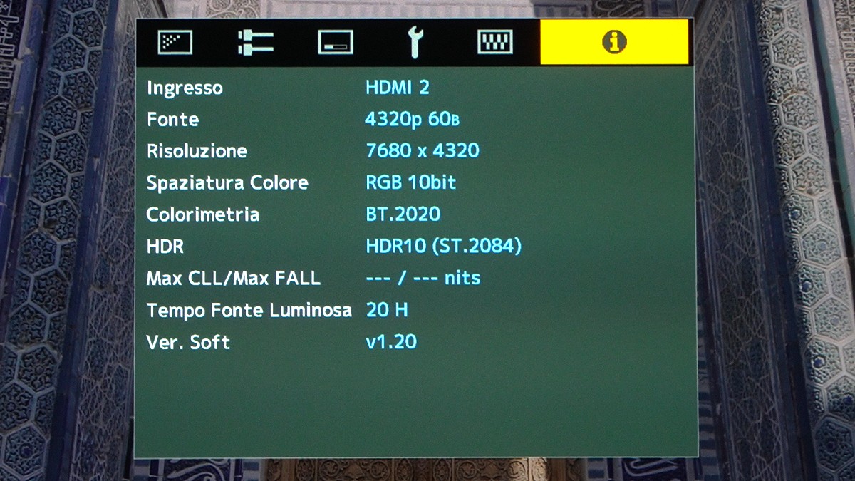 Nessun problema invece per i segnali a risoluzione 8K fino a 60p. Del resto il DLA-NZ7 è dotato di doppio ingresso HDMI a 18 Gbps, il cavo ha consegnato i segnali senza alcun problema e il PC è sempre stato in zona di sicurezza, con la GPU mai oltre il 75% e la CPU (un vetusto core i7 7700K) mai oltre il 10%.