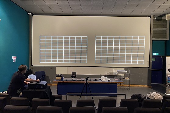 Con i due proiettori a tiro lungo e a tiro medio abbiamo illuminato uno schermo SEPI a guadagno unitario da 2,6 metri di base mentre per il Laser a tiro ultra-corto c'eravamo portati il 'solito' Vividstorm ALR da 100" con salita dal basso che è impegnativo da spostare e trasportare ma che permette di risparmiare tanto tempo nell'allestimento e disallestimento e ha una qualità molto elevata: il nostro test è a questo indirizzo.