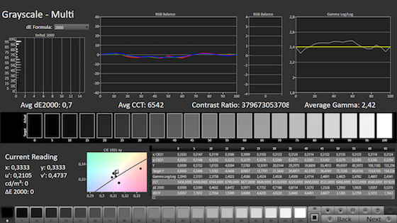 Con impostazioni di default, il 'Delta E' medio è di 2,2 (molto contenuto), con un 'Delta E' massimo di 4,9. Si può quindi notare lo scostamento a occhio ma solo sui livelli più alti della scala dei grigi. Sui colori si nota un rosso che tende a eccedere il Rec.709, influenzando anche le saturazioni intermedie. Il resto dei colori è mediamente piuttosto fedele, con 'Delta E' medio a 2,02 e solo il rosso e alcune sfumature di giallo oltre la soglia critica di 3.