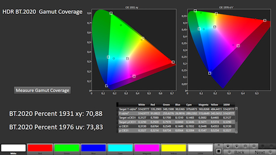 La copertura degli spazi colore è in linea con le prestazioni dei pannelli WRGB: per il BT.2020 si arriva al 70,88% xy e al 73,83% uv mentre il DCI-P3 si attesta al 96,43% xy e al 98,57% uv. Consigliamo infine di disattivare la funzione 'Attenuazione automatica', che regola automaticamente la luminosità in base alla quantità di luce presente nella stanza, soprattutto se sarete in una sala completamente buia.