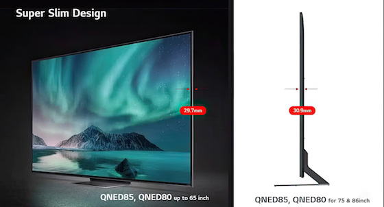 Anche la serie QNED80T è declinata in sei modelli: 43”, 50”, 55”, 65", 75” e 86”. Sono tutti Ultra HD probabilmente con pannelli LCD misti tra IPS e VA. La frequenza di aggiornamento scende a 50 / 60 Hz, motivo per cui non c’è il supporto al FreeSync. La retroilluminazione è senza Mini LED e quasi sicuramente Edge LED. La mancanza dei 120 Hz si riflette anche sugli ingressi che, a livello di banda passante, dovrebbero comportarsi come HDMI 2.0b. Anche QNED80T dispone del design Super Slim.