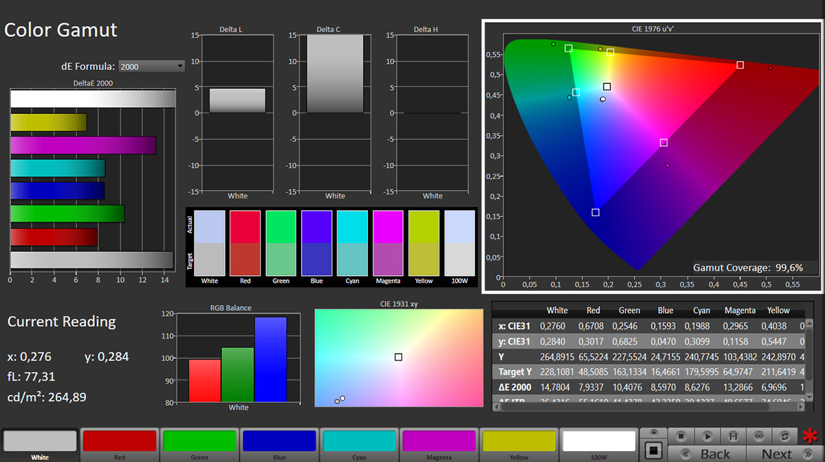Questo causa però una diminuzione del picco di luminanza a 1.100 NIT circa. Si scuriscono inoltre i livelli tra il 25% e il 70%, un comportamento che si può compensare agendo anche sul gamma. Il mio suggerimento, se si vuole contenere l’eccesso di luminanza, è quello di trovare un compromesso intermedio (magari un contrasto 74 o 76), in questo modo si recupera qualche dettaglio sulle alte luci e si evitano chiusure sulle basse. Con queste regolazioni il DeltaE sui colori scende in media tra 1,5 e 1,79 con una punta massima di 2,75. Ottime anche le saturazioni delle coordinate DCI-P3 inscritte nello spazio colore BT.2020: il DeltaE medio è 1,42, quello massimo 2,2. La copertura dello spazio colore BT.2020 è 71,63% xy e 77,94% uv, quella del DCI-P3 arriva invece al 94,94% xy e al 95,05% uv.