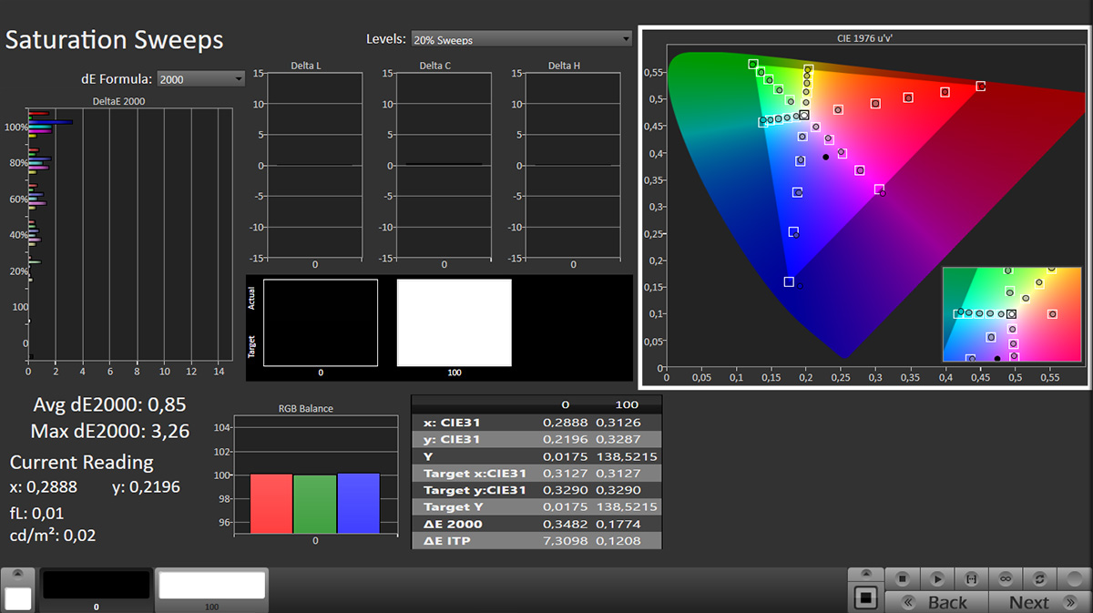 Fatte salve queste considerazioni, la calibrazione mi ha permesso di abbattere l’errore a livelli irrisori: il DeltaE medio in SDR è 0,2 con una punta massima di 0,6 e un gamma quasi perfettamente lineare, prestazioni davvero eccellenti. Migliorano anche i colori: il DeltaE medio sul color checker è 0,62 con un massimo di 2,8 per il blu. I valori non cambiano molto anche per gamut e saturazioni intermedie: su queste ultime la media è 0,85 con un massimo di 3,26 per il blu. Attenzione alle regolazioni: quelle relative alla tinta sono davvero poco efficaci. Sconsiglio anche di intestardirsi sul miglioramento del blu: i controlli lo consentirebbero ma i miglioramenti sulla saturazione al 100% corrispondono a peggioramenti pari o superiori su tutti gli altri livelli. Meglio una soglia di errore un po’ più pronunciata su un solo punto piuttosto che livellata verso l’alto su tutte le saturazioni del blu.