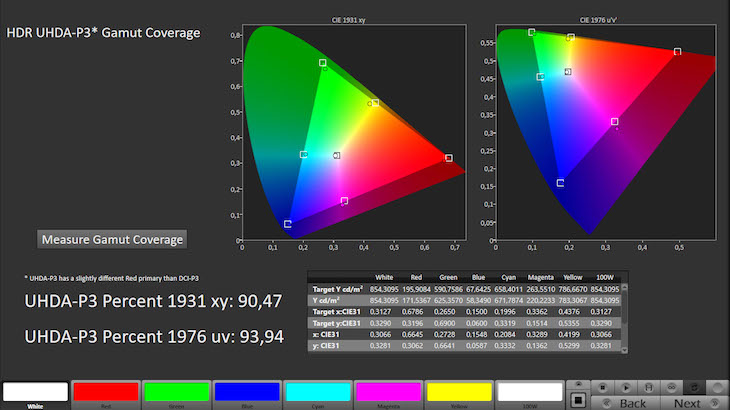 Color checker e saturazioni DCI-P3 in modalità Filmmaker HDR