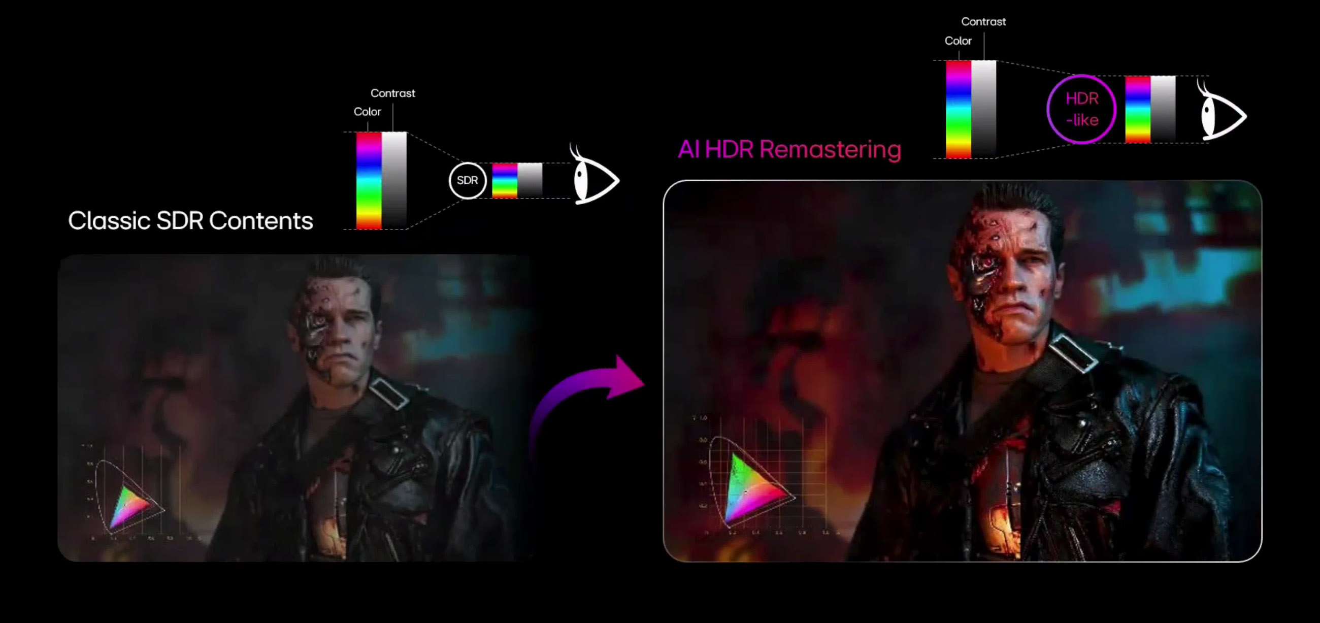 Espande la gamma dinamica e i colori dei contenuti SDR, approssimando l’effetto di una versione HDR nativa. LG ha spiegato che, secondo varie ricerche, la maggior parte delle persone utilizza ancora sorgenti SDR, ad esempio con i piani standard dei servizi di streaming. La funzione nasce quindi per sfruttare le potenzialità dei pannelli anche con segnali in gamma dinamica standard.